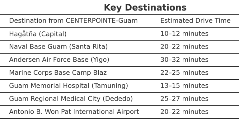 As shown on the map, CENTERPOINTE–Guam is positioned in the geographic heart of the island, offering balanced access to Guam’s major U.S. military installations and federal facilities.
